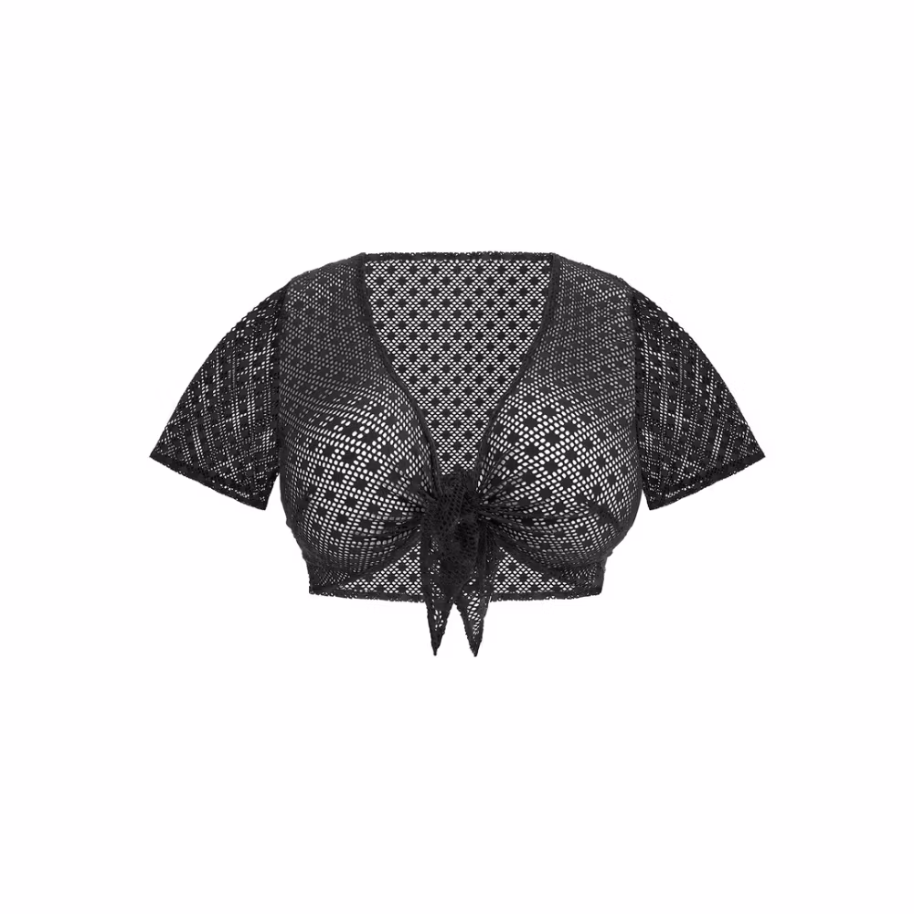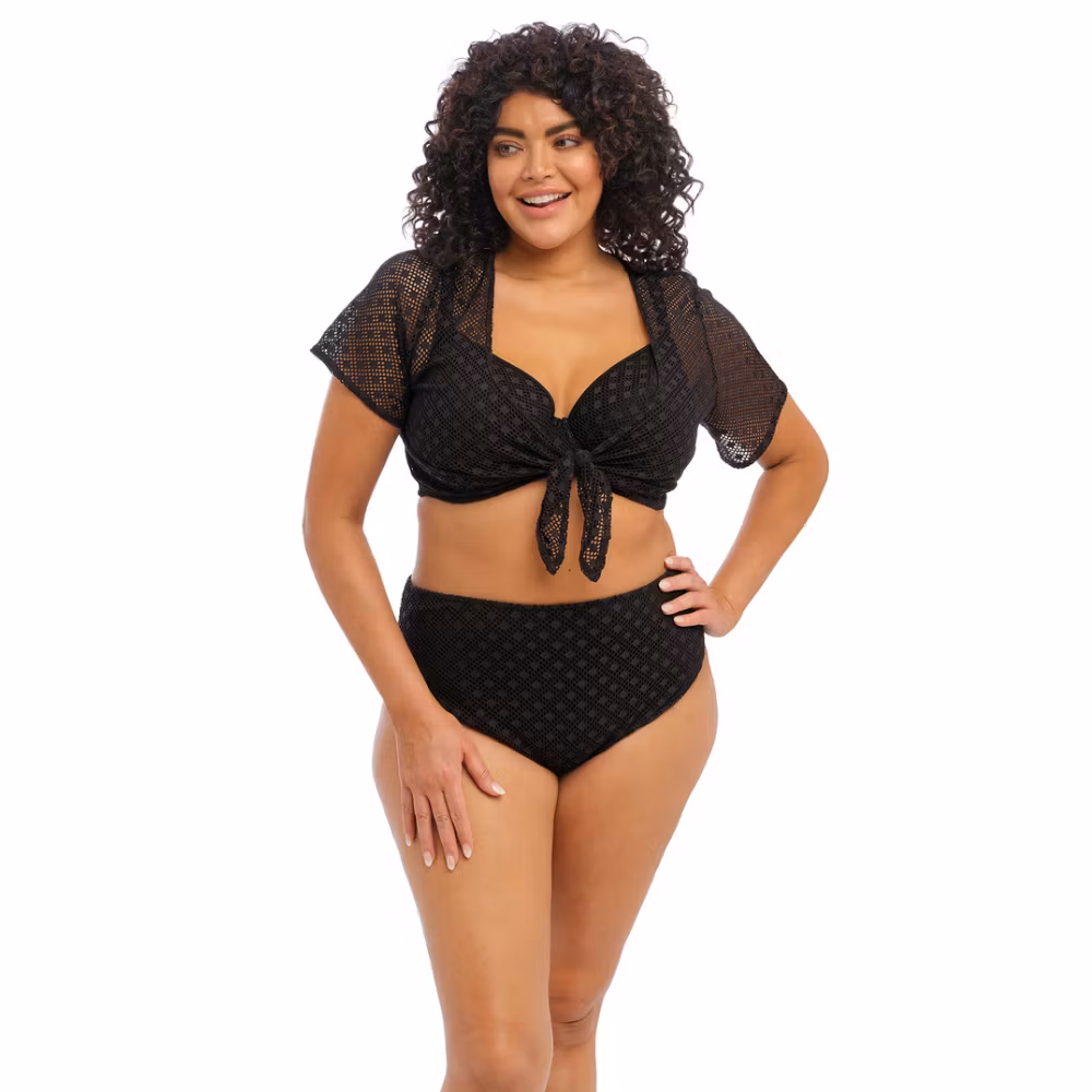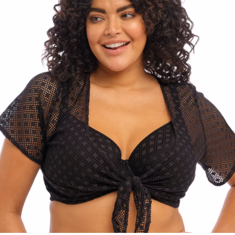 Strandtopp från Elomi i kollektionen Bazaruto, tillverkad i virkningsinspirerat tyg med korta löst sittande ärmar. Knytdetaljen fram ger enkel passform och den låga V-urringningen passar fylligare byst. Mjuka kanter utan elastik gör att toppen enkelt viks ihop i en strandväska.