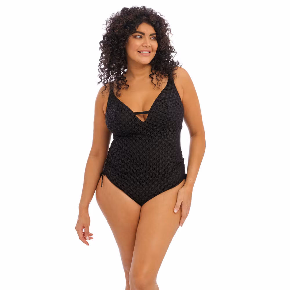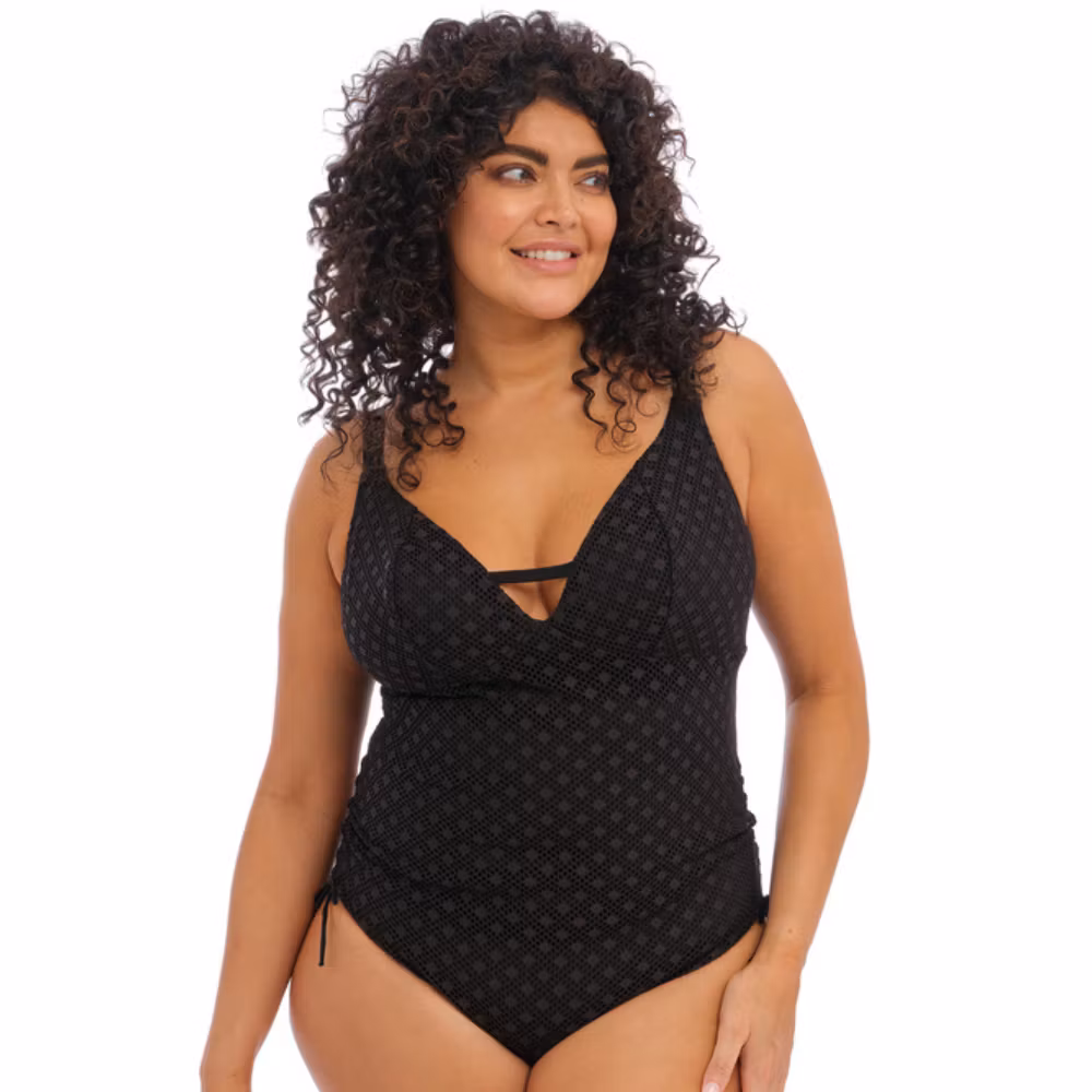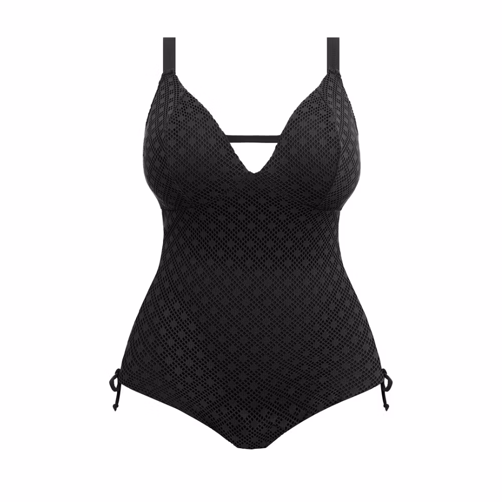 Baddräkt från Elomi i kollektionen Bazaruto, tillverkad i ett virkningsinspirerat tyg med heltäckande opakt foder. Den djupa V-urringningen med nyckelhalsbak ger en snygg siluett, och de justerbara knytbanden i sidorna låter dig anpassa passformen efter din kropp.