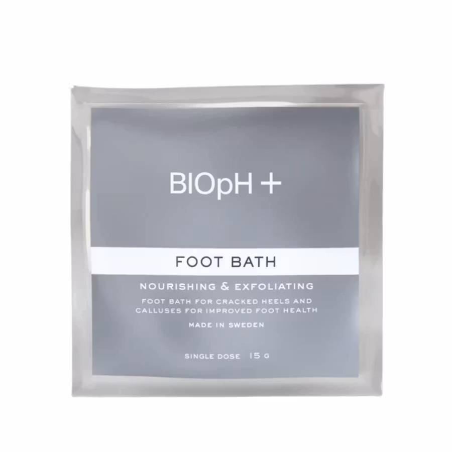 BIOpH+ Foot bath singeldos är en färdig engångsdos som blandas i varmt vatten för ett enkelt fotbad hemma. Den passar när du vill göra en snabb och smidig fotrutin utan att mäta upp själv.